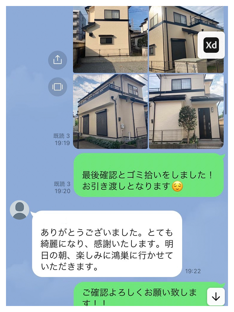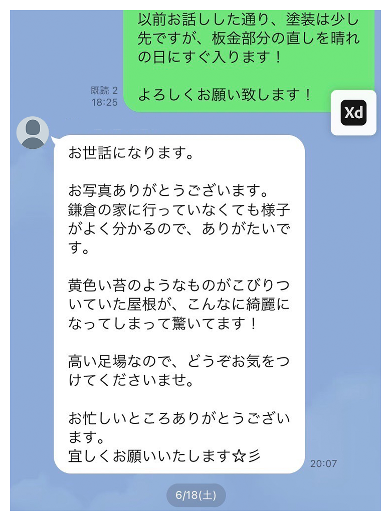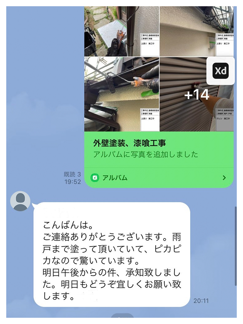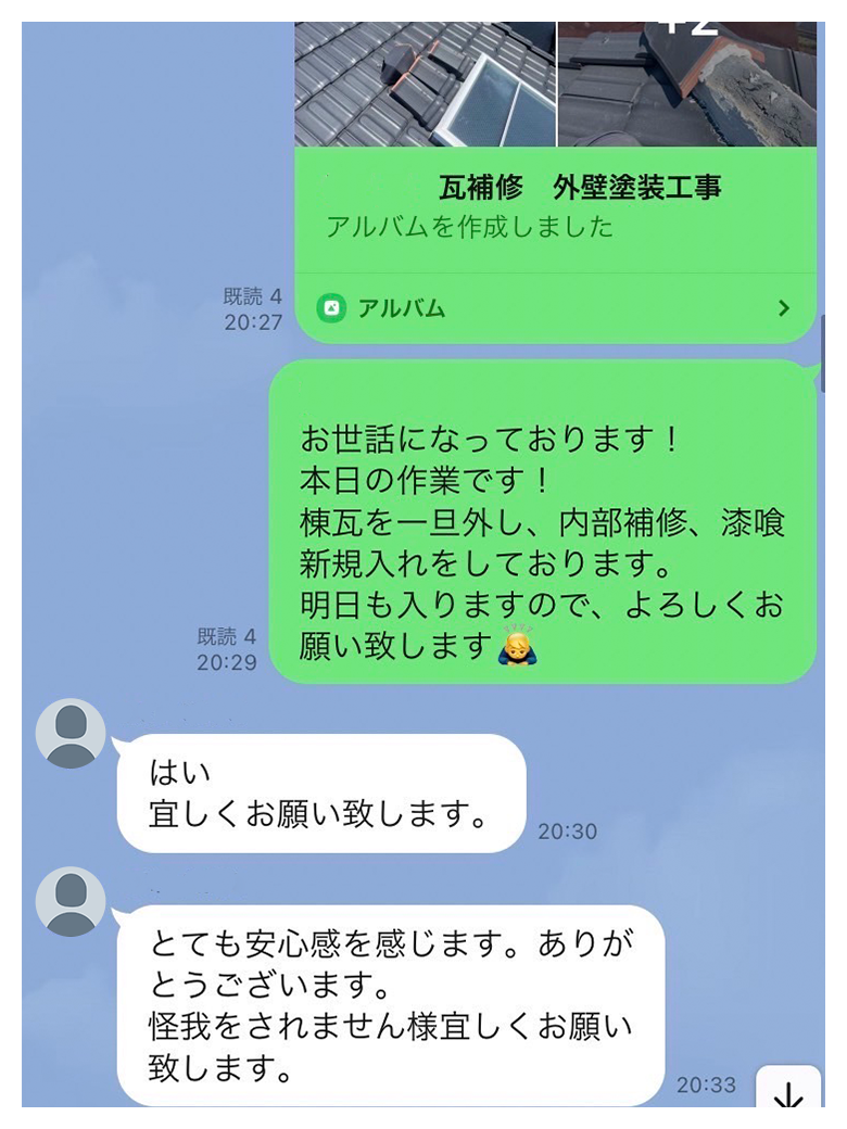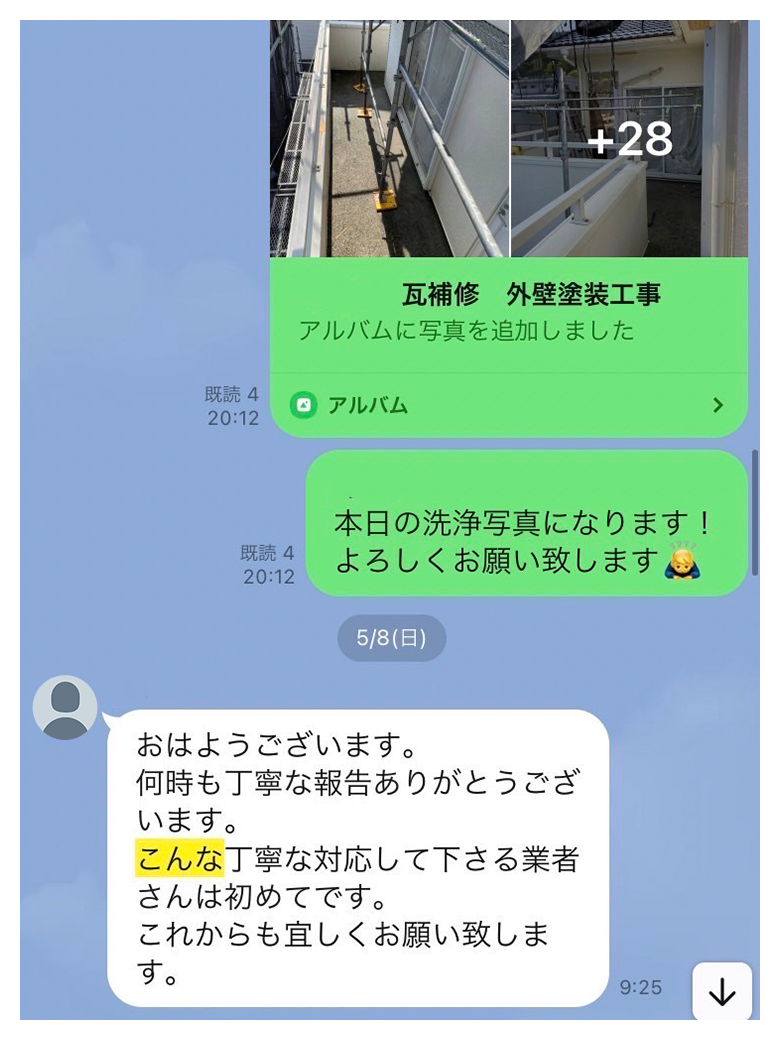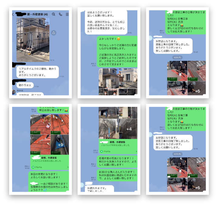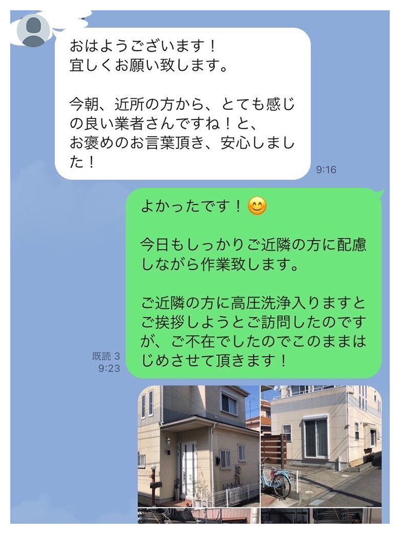 LINEでお客様とコミュニケーションを取ります!リアルタイムでの進捗報告はもちろん、使用する塗料、施工する職人までご連絡!疑問や不安にもすぐに対応します!